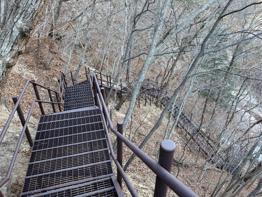 여기서 잠시 고민했답니다. 아니 저것이 용소폭포라고!? 약간 실망했지만 여기까지 와서 그냥 가는 건 아닌 것 같아 내려가려고 하니 보이는 건 까마득한 계단.. 계단을 내려갔습니다.