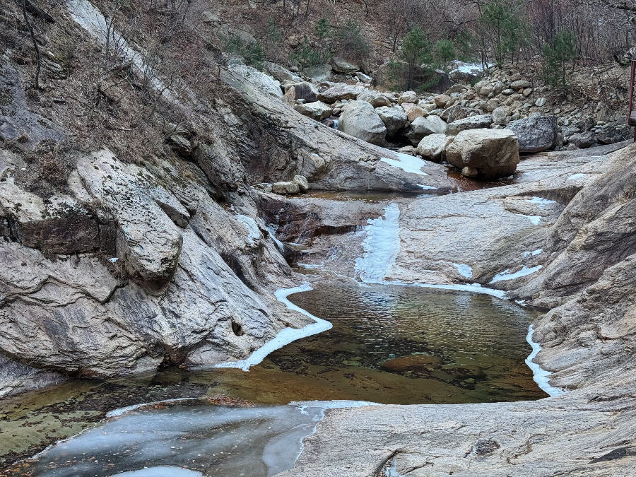 성국사를 기점으로 데크가 깔려있는 곳도 있지만 계단도 있고 돌길도 있어 본격적인 탐방로가 시작된답니다. 가벼운 산책정도만 하고 싶으시다면 성국사까지만 탐방하고 내려가셔도 좋을 것 같습니다. 하지만 주전골의 기암괴석은 이제부터 볼 수 있답니다. 선녀탕은 주전골 탐방로의 중간 기점입니다. 선녀탕까지는 길이 오르락내리락하지만 그렇게 험하지 않아서 기암괴석을 구경하면서 가기 좋습니다. 올라가는 길 내내 앙상한 나뭇가지와 얼어있어 에메랄드색인지 확인이 불가한 강물만 보고 있다가 보게 된 기. 암. 괴. 석! 먹으로 그린 바위가 그대로 눈앞에 나타난 것 같은 모습에 깜짝 놀라실 거예요~