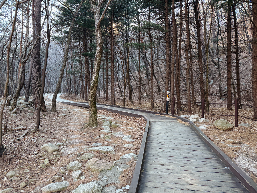 길이 나무 데크로 쭉 이어져있어 무장애 탐방로라는 타이틀처럼 휠체어를 타고도 이동이 가능하도록 되어있는데요. 울퉁불퉁한 돌 길이 아니라서 무릎이 안 좋은 연세가 있으신 분들도 편하게 올라갈 수 있도록 되어 있습니다. 아직은 연세가 지긋(?) 하지 않은 저도 산책하듯이 편히 올라갈 수 있었답니다.
