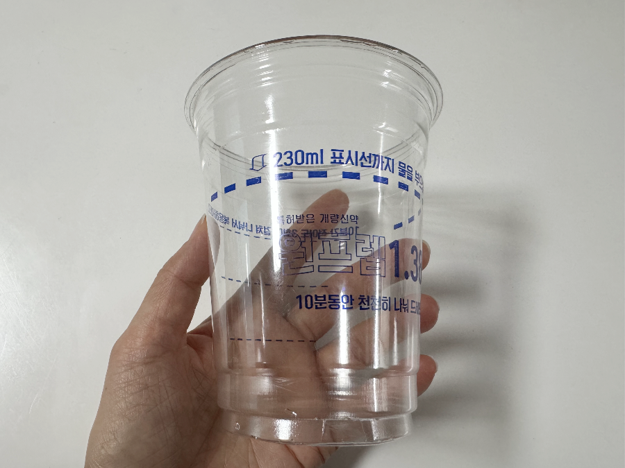 A제와 B제를 플라스틱컵에 붓고 물을 230ml에 맞게 부어준 후 잘 저어서 10분 동안 마시면 됩니다. 플라스틱 컵에는 친절하게 230ml에 맞게 선을 그려져 있어 물을 붓고 마시기 편하답니다. 조제약 230ml를 10분 동안 다 마셨다면 이제는 물을 20분 동안 460ml 마셔야 하는데요. 플라스틱컵으로 2컵을 마시면 됩니다. 여기까지가 전반전이고 후반전에 동일한 방법으로 한번 더 반복하면 총 1.38l의 물을 마시게 된답니다.