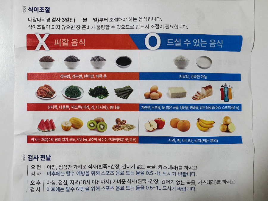 대장내시경 검사 3일 전부터는 식이조절을 해야 합니다. 3일 동안 먹을 수 있는 음식은 생각보다 종류가 많은데요. 흰밥, 흰 죽, 달걀, 두부, 묵, 맑은 국물, 생선, 빵, 맑은 음료, 사과, 배, 바나나, 감자입니다. 검사가 오전일 때는 전날 아침과 점심으로 흰 죽, 카스테라, 건더기 없는 국물을 먹으면 되고 오후일 때는 저녁 6시 전까지 흰 죽, 카스테라, 건더기 없는 국물을 먹으면 됩니다. 물은 대장정결제 조제약을 먹을 때까지 계속 마셔도 된답니다.