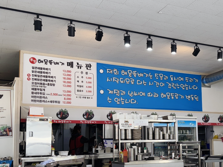 통영해물뚝배기 내부는 평범합니다. 반찬을 리필할 수 있는 셀프바가 있고 전복과 조개가 들어있는 수족관이 한쪽에 있습니다. 메뉴가 해산물이라 테이블에 비닐이 깔아져 있는데요. 사장님께서 깔끔한 성격이신 것 같았습니다. 저희가 갔을 땐 점심시간이 살짝 지나 식당이 한가한 편이었는데 사장님이 빈 테이블 의자를 하나씩 꼼꼼하게 닦고 계셨답니다.