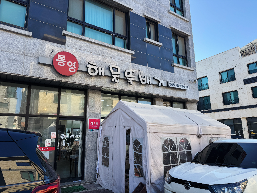 통영해물뚝배기 운서점은 카페와 맛집이 모여있는 운서역 근처에 있습니다. 간판에는 영종점이라고 되어있는데 운서역과 가까워서 그런지 지도에서는 통영해물뚝배기 운서점이나 운서역 통영해물뚝배기로 뜹니다. 건물 앞과 옆에 2-3대 정도 주차공간이 있긴 하지만 운이 좋아야 주차가 가능할 것 같구요. 건물 근처 길 옆이나 임시 주차장에 주차하면 됩니다. 저희는 주차할 곳을 찾다가 조금 멀리 떨어져 있는 임시 주차장에 주차를 했습니다.