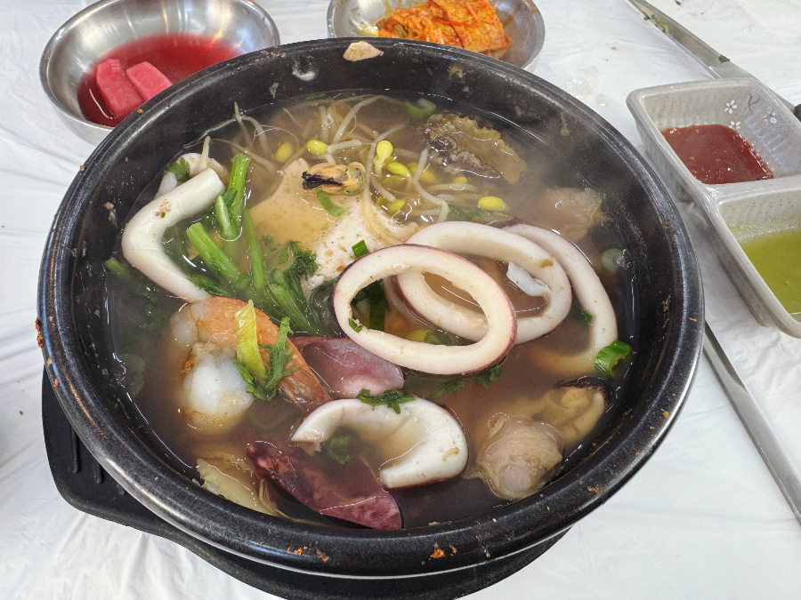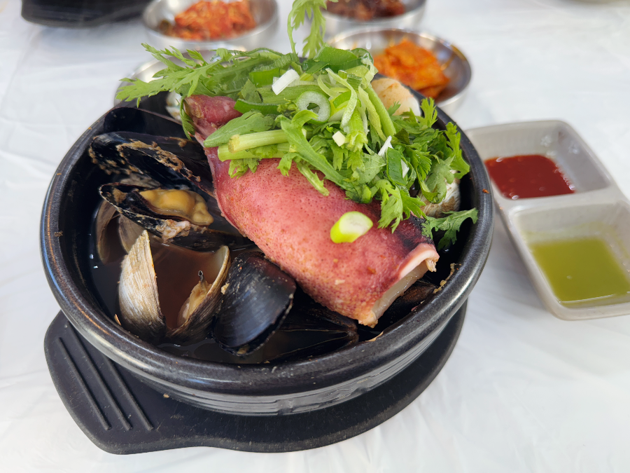 해물뚝배기는 주문을 하면 그때부터 조리를 하기 때문에 나오는데 시간이 조금 걸리는데요. 조금 기다리면 통오징어가 올라가 있는 푸짐한 해물을 먹을 수 있습니다.