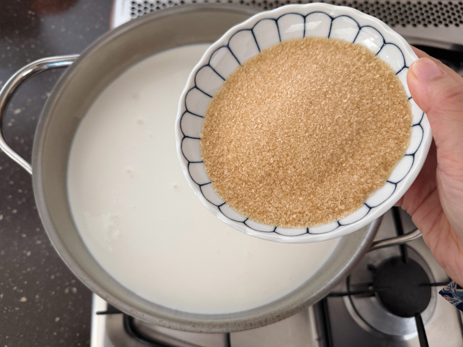 우유에 생크림, 설탕을 넣고 약한 불에서 저으면서 설탕을 먼저 녹여주세요.