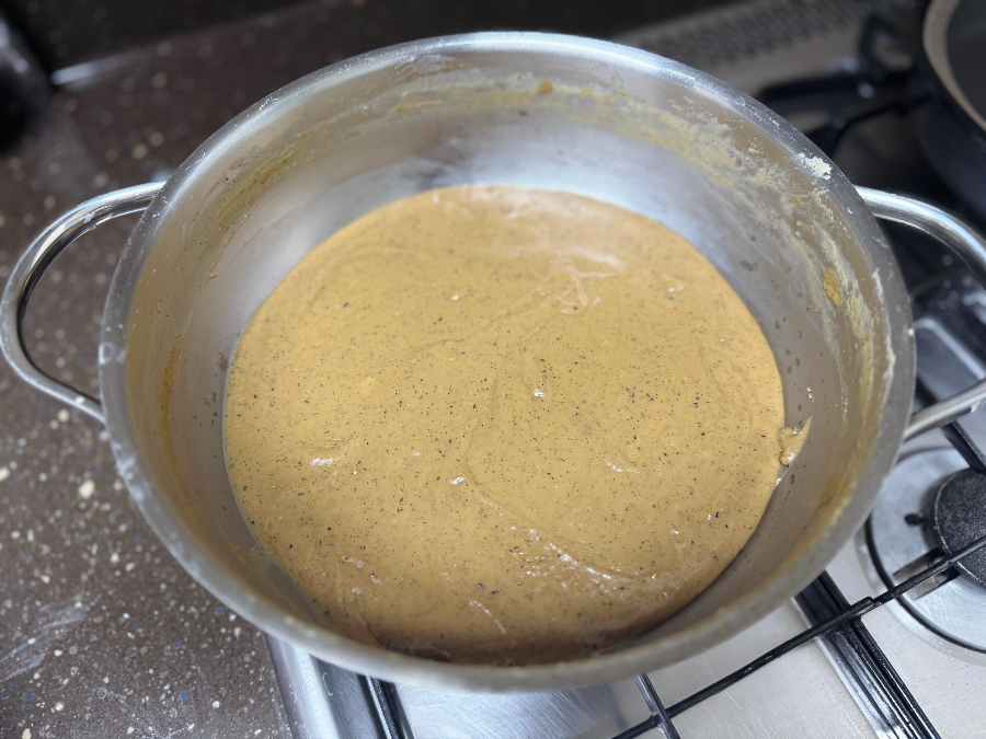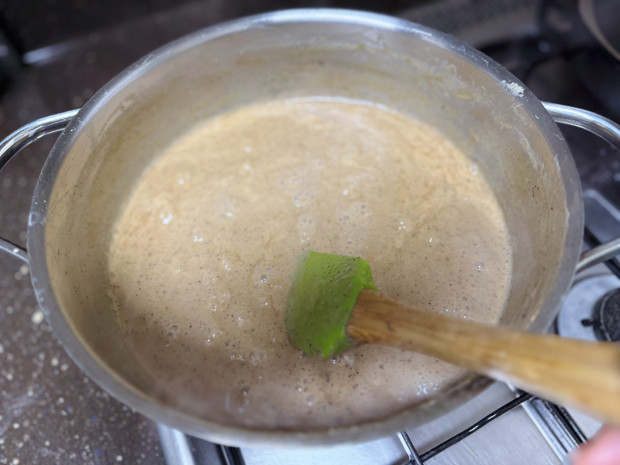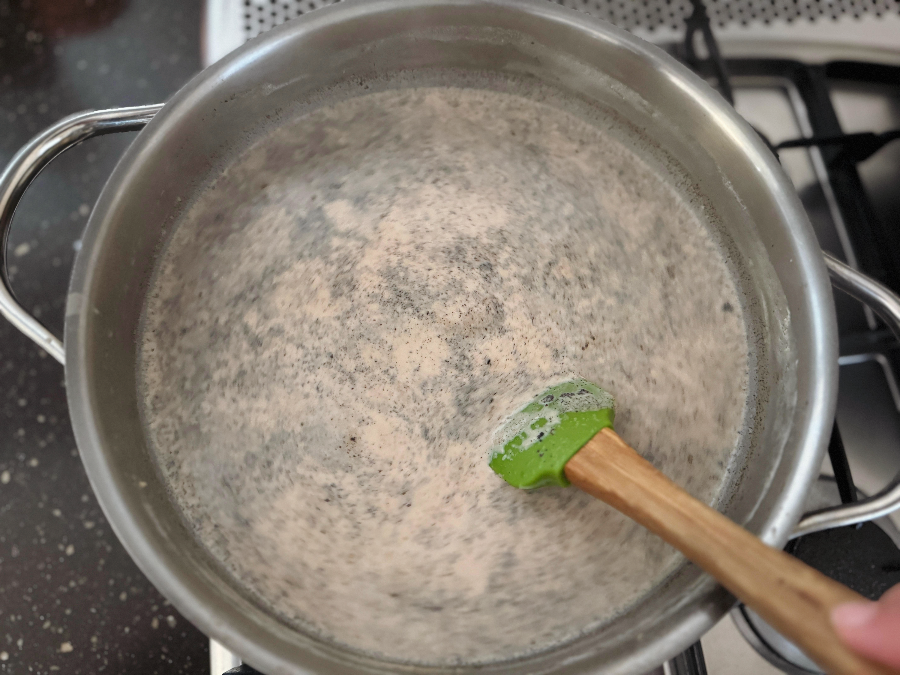 이제 계속 젓기만 하면 됩니다. 바닥이 눌어붙지 않도록 계속 바닥을 긁으면서 젓고 또 저어주세요~ 계속 휘젓다 보면 묽었던 우유가 점점 졸아든답니다.