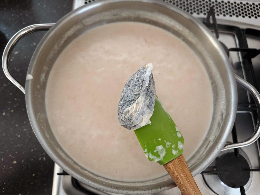 재료가 다 들어가도 여유 공간이 충분한 냄비, 우유 900ml, 생크림 500ml, 설탕 80g, 얼그레이티 10g, 다시백 1개(얼그레이 티백 사용 시 생략)