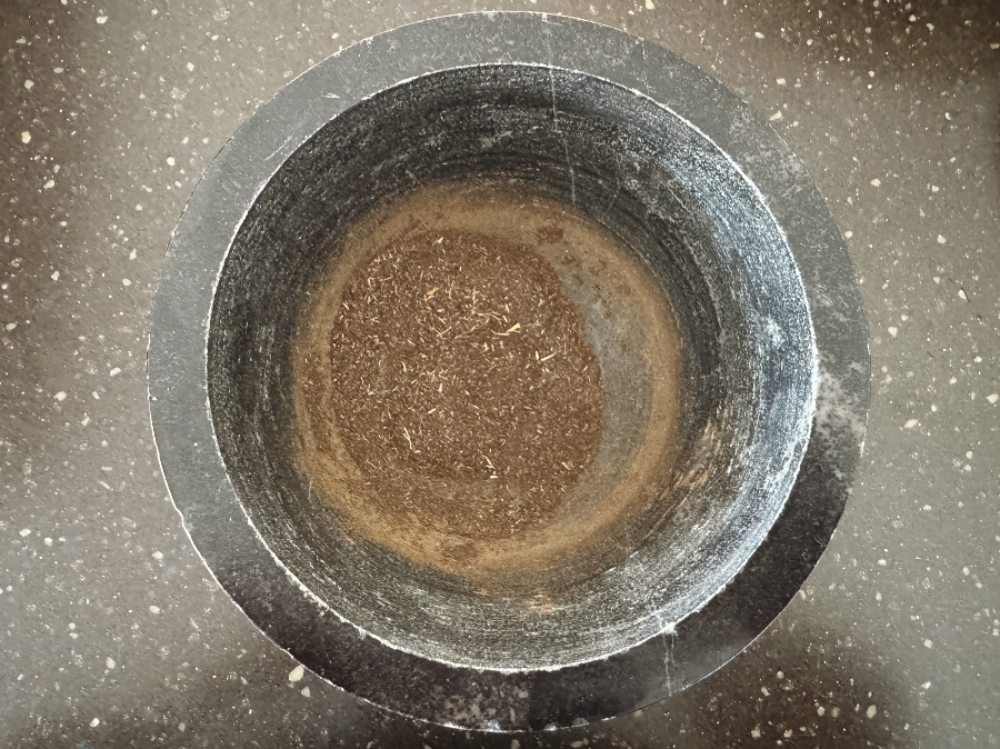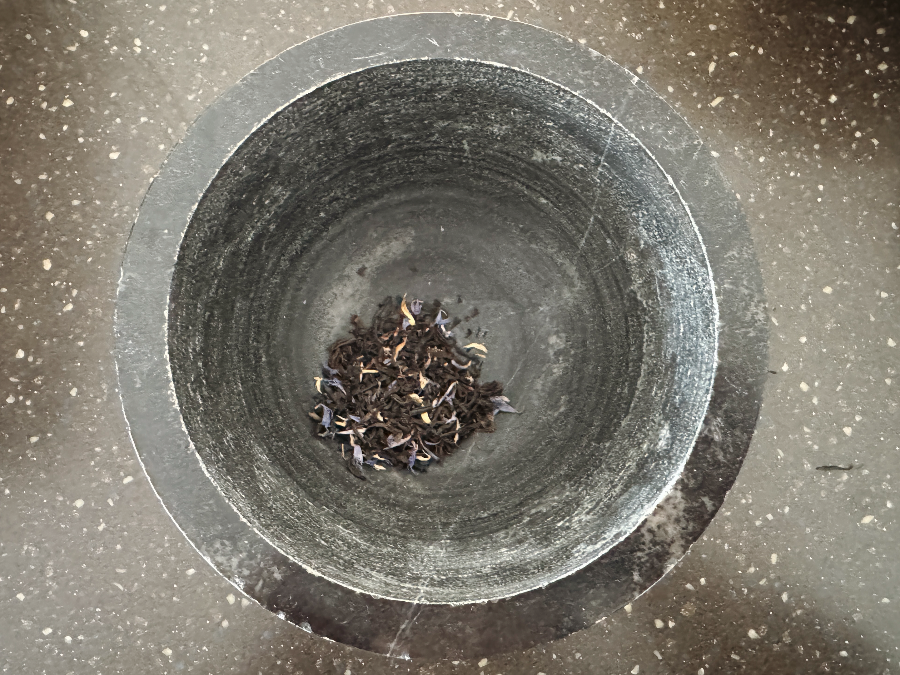 저는 잼에 얼그레이가 살짝 콕콕 박혀있는 것이 좋아서 10g에서 2g 정도만 미리 덜어내고 나머지만 티백에 넣어줬습니다. 2g은 티백을 우려낸 뒤 넣고 저어주면 되는데요. 잼에 잎이 씹히는 건 싫어서 돌절구로 마구 갈아줬답니다. 깔끔한 잼이 좋다면 티백만 넣고 차를 우려내 주세요.