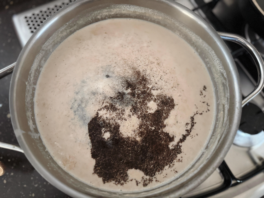 10분 후 티백을 건져내고 미리 갈아놓은 얼그레이차 가루를 넣어주세요. 깔끔한 잼이 좋다면 가루를 넣지 않아도 됩니다~