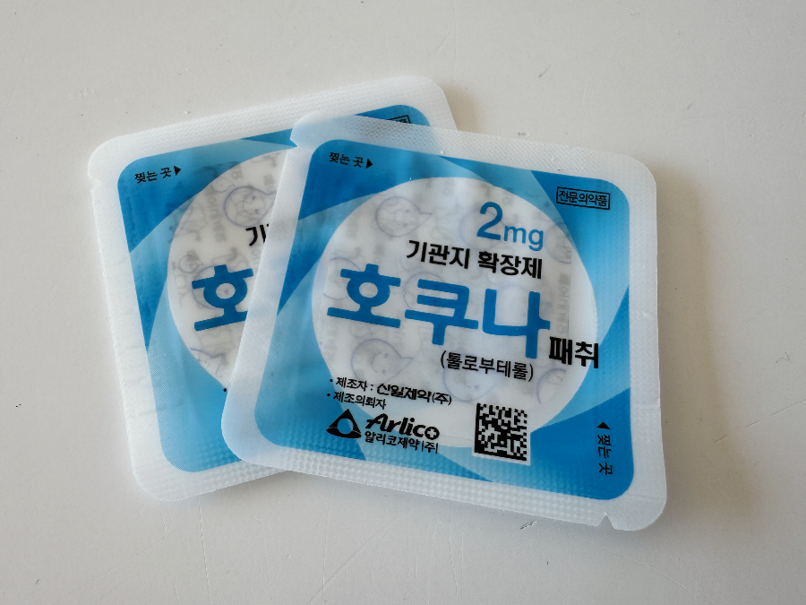 호쿠나 패치는 기관지 천식, 급성 기관지염, 만성 기관지염, 폐기종 등에 효과가 있는 제품입니다. 호쿠나 패치 주요 성분인 툴로부테롤은 기관지에서 아드레날린성 수용체를 자극하여 기관지를 이완시켜 부종을 줄이고 호흡곤란, 기침을 완화시키는 약물입니다. 나이에 따라 툴로부테롤 사용 용량이 다른데요. 6개월에서 3세 미만은 0.5mg, 3세에서 9세 미만은 1mg, 9세 이상은 2mg이 들어있습니다. 남편이 처방받아 온 패취는 2mg 패치입니다.