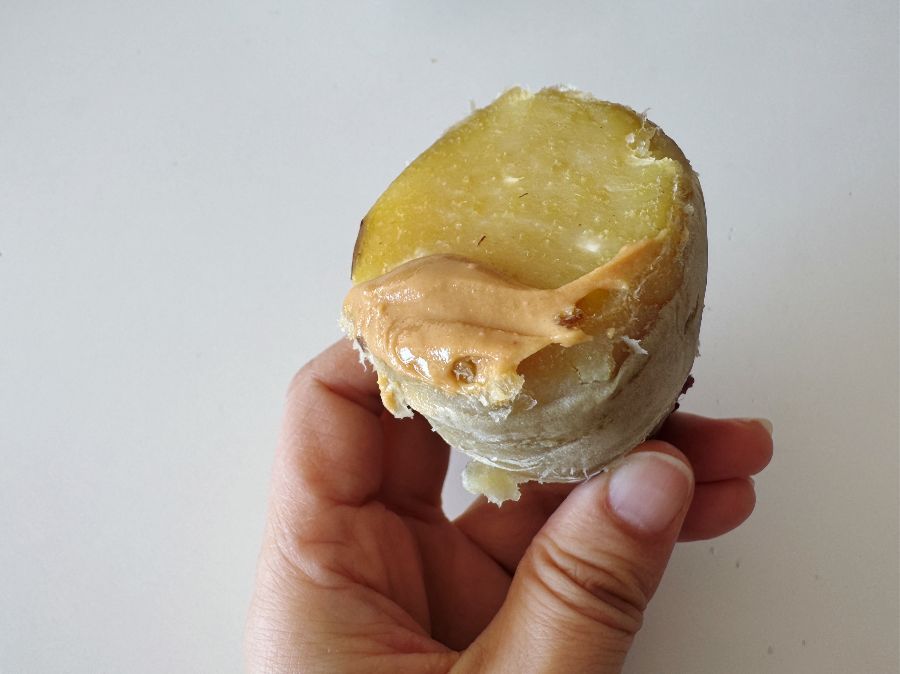 삶은 고구마가 있어 고구마에도 땅콩버터를 발라서 먹어봤는데요. 목이 어찌나 메는지.. 이 조합은 아닌 걸로..