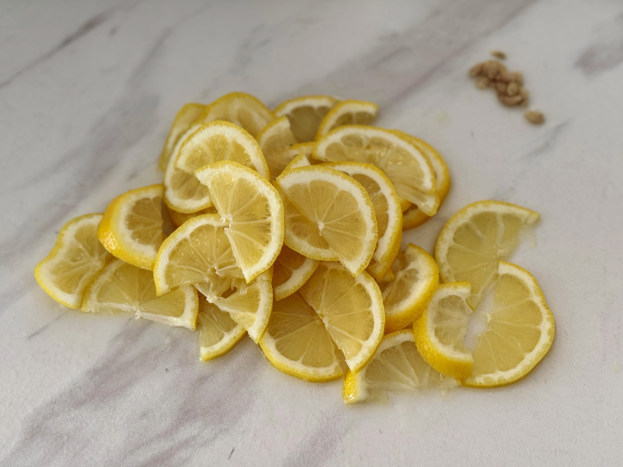 깨끗하게 씻은 레몬은 물기를 닦아내고 원하는 모양으로 총총총~ 썰어 주세요. 꼭지가 있는 양쪽 끝부분은 잘라내고 씨도 빼주세요.