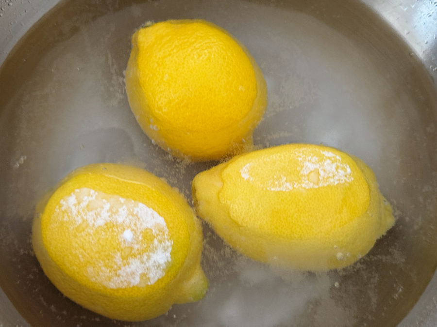 레몬 껍질에는 레몬과육보다 5-10배가 많은 비타민C가 들어있습니다. 껍질을 벗겨서 청을 만들어도 되지만 깨끗하게 씻어서 껍질 채로 레몬꿀청을 만들었답니다. 껍질채로 먹기 위해 레몬을 깨끗하게 씻어야 하는데요. 베이킹소다를 넣고 레몬 겉 부분을 문질러준 후 물을 붓고 30분 정도 담가뒀다가 깨끗하게 물로 씻어 주세요.
