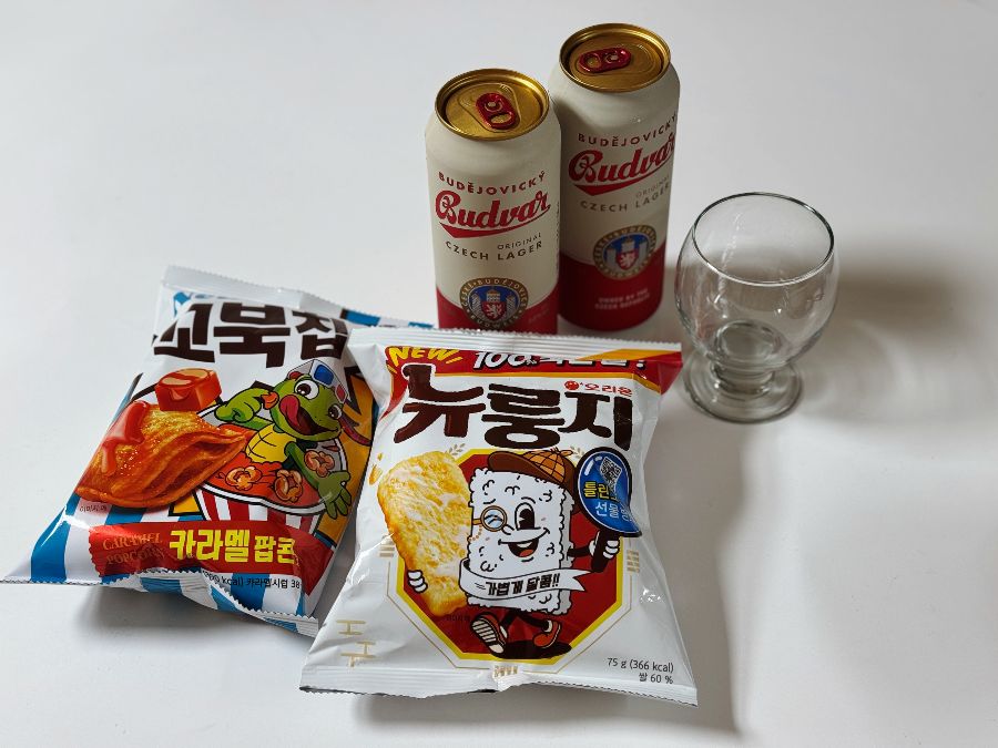 집 근처 GS프레시에서 체코맥주 부드와이저를 발견했답니다. 어머~ 이건 마셔야 해 이러면서.. 몇 년 전 체코에 갔을 때 매일 밤 마셨던 부드와이저를 냉큼 장바구니에 넣고 안주로 카라멜팝콘맛 꼬북칩과 뉴룽지를 사가지고 왔습니다.