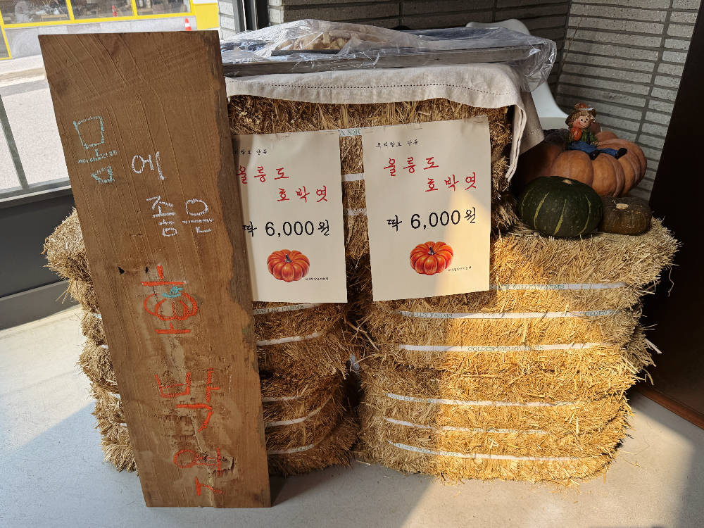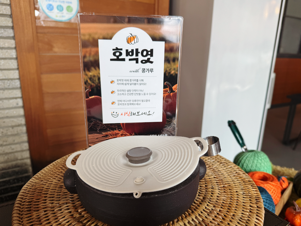 이름처럼 정말 고기와 야채가 산더미였는데 한 그릇 뚝딱 다 먹었답니다. 달큰하고 맵지 않은 호박찌개여서 맛있게 잘 먹었습니다. 계산하는 카운터에 콩가루가 묻어있는 울릉도 호박엿이 있는데요. 나갈 때 잊지 말고 시식해 보세요. 이에 많이 달라붙지 않고 고소합니다. 호박농원에 잘 어울리는 디저트네요~