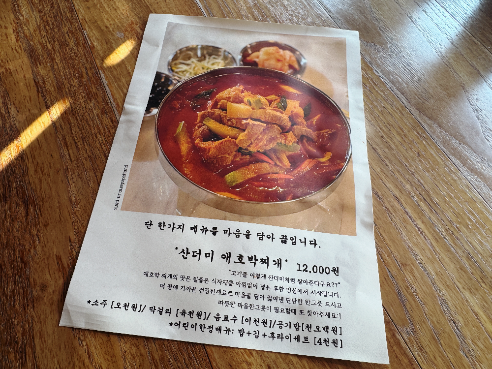매장 안은 식당이라기보다 카페 같은데요. 천장도 높고 조명도 반짝반짝 이쁩니다. 많은 사람들이 식사 중이라 내부 사진은 못 찍었답니다. 메뉴는 산더미 애호박찌개 하나입니다. 오잉~ 소주나 막걸리, 음료수, 공깃밥 외 다른 메뉴는 없습니다. 메뉴 고민할 필요가 없어 좋네요~ 단일메뉴로 승부를 보다니 사장님의 자신감 뿜뿜이 느껴집니다. 애호박찌개가 고추장베이스라 그런지 어린이 한정메뉴가 있는데요. 가족이 방문하면 어른들은 애호박찌개, 아이들은 김과 달걀프라이를 먹을 수 있어 좋을 것 같습니다.
