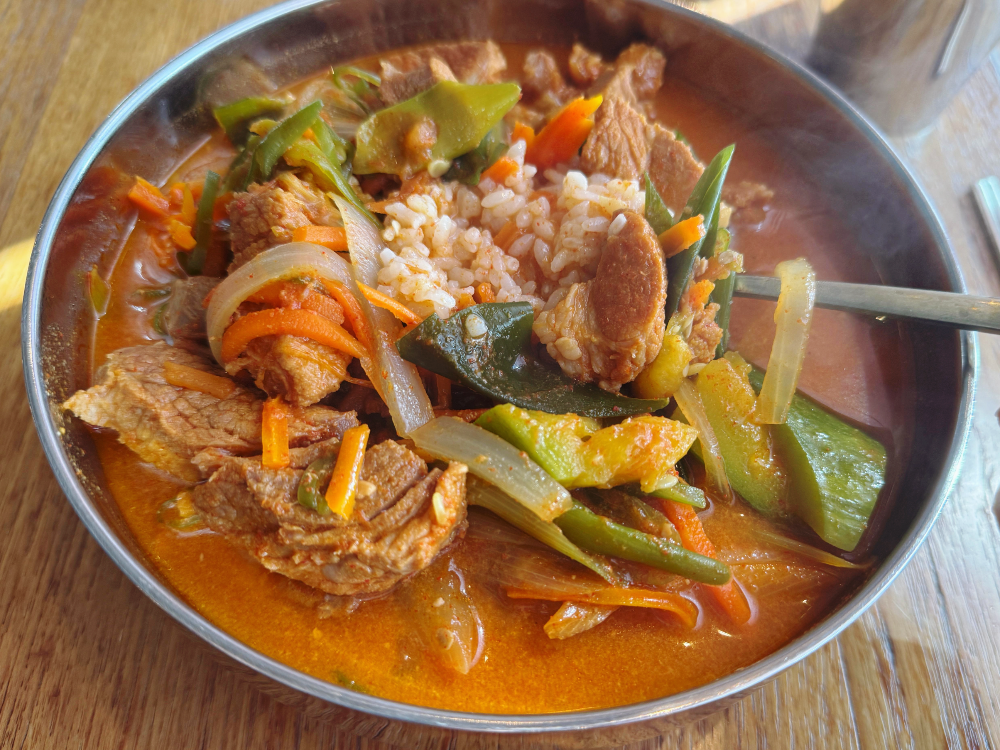 밥은 따로 나오는 것이 아니라 찌개 안에 토렴 되어 들어있습니다. 애호박찌개 속 밥알이 달근한 국물을 잘 머금고 있어서 맛있게 먹었답니다. 찌개에는 호박과 파, 양파 같은 야채들이 가득 들어 있어 국물이 달근하고 맵지는 않습니다. 고기가 진짜 많이 들어있는데요. 비계가 같이 붙어 있는 부분도 있고 살코기만 있는 부분도 있습니다. 살코기는 숟가락으로 자를 수 있을 정도로 엄청 부드럽습니다. 고기가 많아서 그런지 살짝 마른 고기도 있어 조금 아쉬웠는데 전체적으로 고기와 야채들은 신선했습니다.