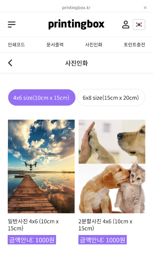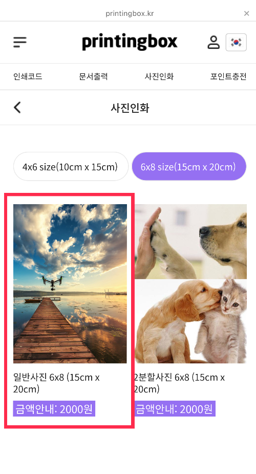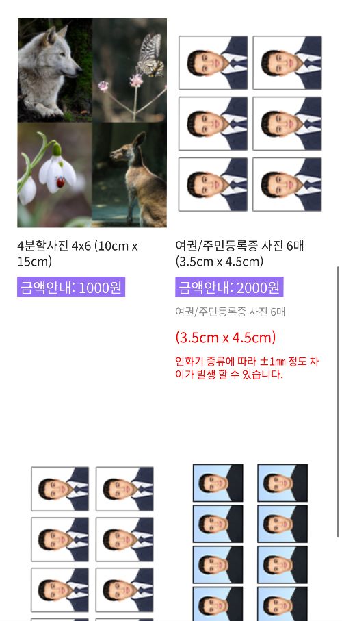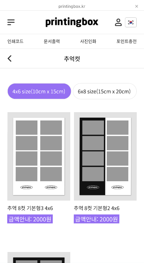 프린팅박스에서 이용가능한 서비스는 크게 문서출력과 사진인화입니다. 사진인화의 경우 4x6사이즈와 6x8사이즈, 증명사진, 포토달력, 추억컷 사진을 인화할 수 있는데요. 사진의 경우 화면분할과 크기를 몇 가지 샘플 중에서 골라서 인화할 수 있습니다. 증명사진은 여권용, 주민등록증용과 반명함판 등 3가지 사이즈가 있습니다. 증명사진 원본이미지가 있다면 2000원에 사진 6매를 인화할 수 있어 저렴하게 이용할 수 있답니다.
