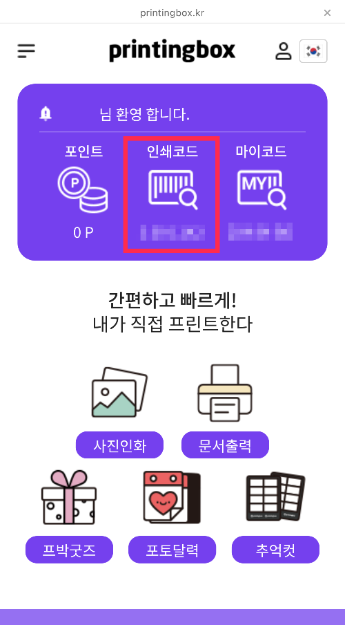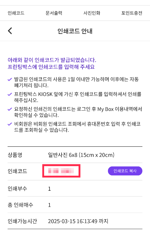 파일을 업로드하면 인쇄코드가 발급됩니다. 이 인쇄코드를 프린팅박스 키오스크에 입력하면 출력이 되는데요. 인쇄코드는 메인화면에서도 확인할 수 있습니다. 인쇄코드는 24시간 동안 유효하고 그 이후에는 폐기되기 때문에 인쇄가능 시간 안에 출력해야 한답니다.