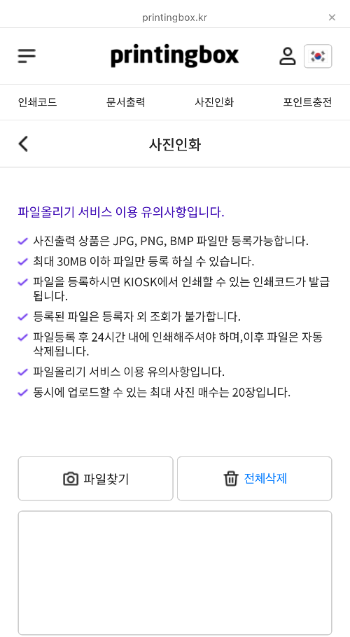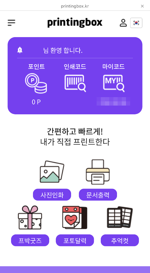 프린팅박스를 이용하기 위해서는 출력하려고 하는 파일을 프린팅박스 클라우드에 올려야 하는데요. 핸드폰에 프린팅박스 앱을 설치하거나 홈페이지에서 회원가입을 해야 합니다. 회원가입을 하지 않고 비회원으로도 이용할 수 있습니다. 저는 핸드폰에서 프린팅박스를 검색해 모바일페이지로 접속해서 회원가입을 한 후 파일을 올렸답니다.