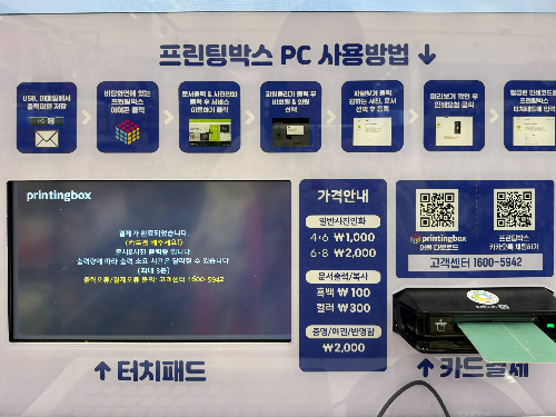 프린팅박스는 핸드폰이나 PC에 있는 사진, 문서를 간편하게 인화하고 출력할 수 있는 무인발급 키오스크입니다. CU, 세븐일레븐, 이마트24 같은 편의점과 아트박스에 많이 설치되어 있는데요. 저희 동네는 아트박스에 설치되어 있습니다. 편의점에 설치되어 있는 프린팅박스는 24시간 이용이 가능하기 때문에 급하게 프린팅해야 할 경우 더 편리하게 이용할 수 있답니다.