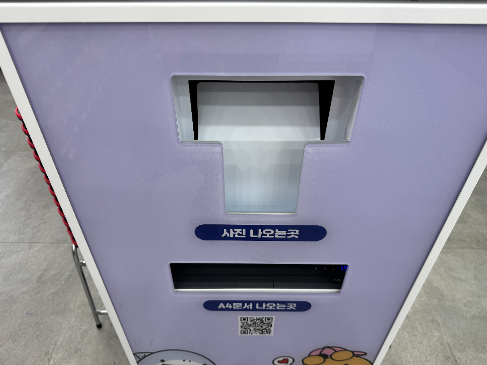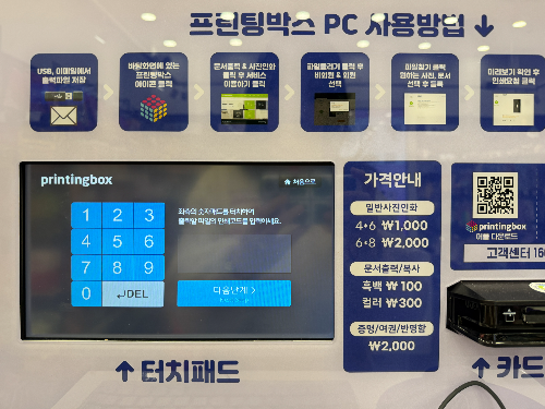 키오스크 왼쪽 하단 터치패드에서 사진출력하기를 누르고 인쇄코드를 눌러 화면에서 출력할 이미지를 확인한 후 결제하면 끝! 너무 쉽죠?