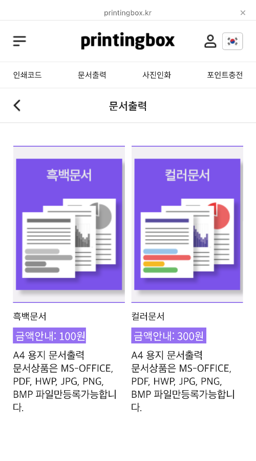 프린팅박스에서는 문서출력도 가능합니다. MS오피스, PDF, 한글파일, JPG, PNG, BMP파일과 30mb 이하 파일만 업로드할 수 있습니다. A4 1장 인쇄 가격은 흑백 100원, 컬러 300원인데요. 문서출력 요금은 사진인화에 비해 조금 비싼 것 같습니다.