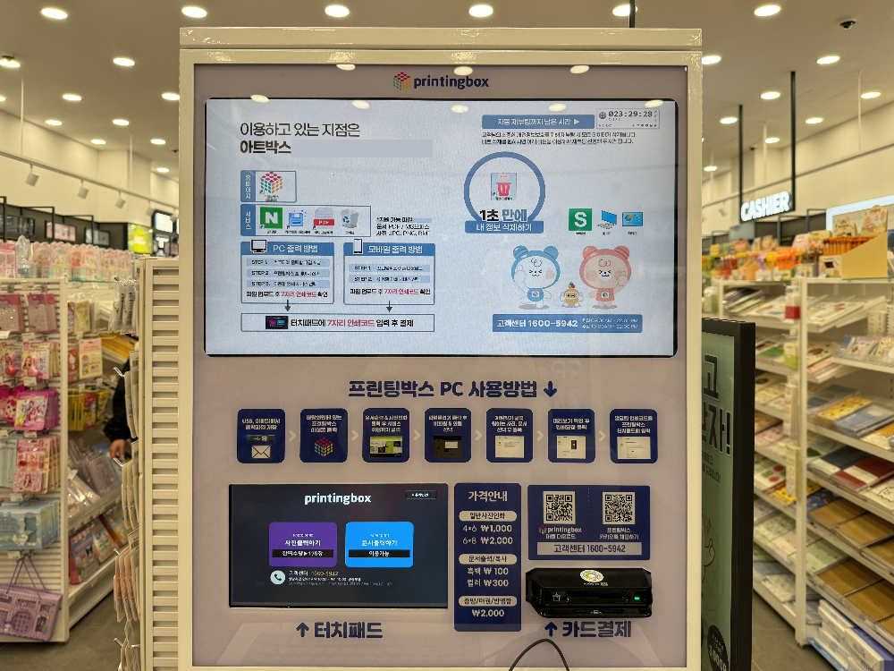 프린팅박스는 핸드폰이나 PC에 있는 사진, 문서를 간편하게 인화하고 출력할 수 있는 무인발급 키오스크입니다. CU, 세븐일레븐, 이마트24 같은 편의점과 아트박스에 많이 설치되어 있는데요. 저희 동네는 아트박스에 설치되어 있습니다. 편의점에 설치되어 있는 프린팅박스는 24시간 이용이 가능하기 때문에 급하게 프린팅해야 할 경우 더 편리하게 이용할 수 있답니다.