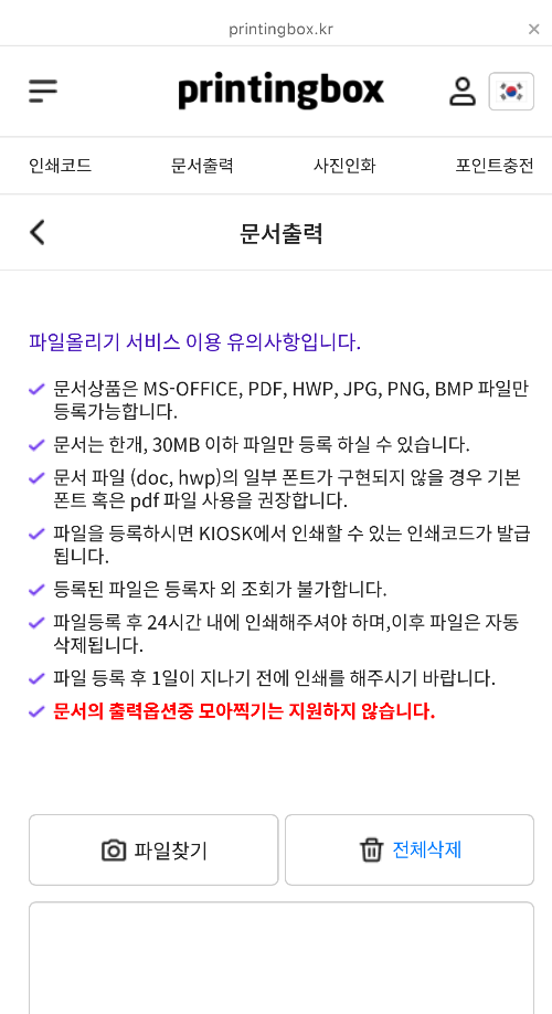 프린팅박스에서는 문서출력도 가능합니다. MS오피스, PDF, 한글파일, JPG, PNG, BMP파일과 30mb 이하 파일만 업로드할 수 있습니다. A4 1장 인쇄 가격은 흑백 100원, 컬러 300원인데요. 문서출력 요금은 사진인화에 비해 조금 비싼 것 같습니다.