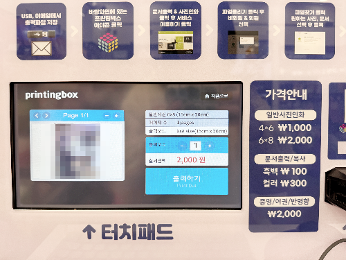 키오스크 왼쪽 하단 터치패드에서 사진출력하기를 누르고 인쇄코드를 눌러 화면에서 출력할 이미지를 확인한 후 결제하면 끝! 너무 쉽죠?