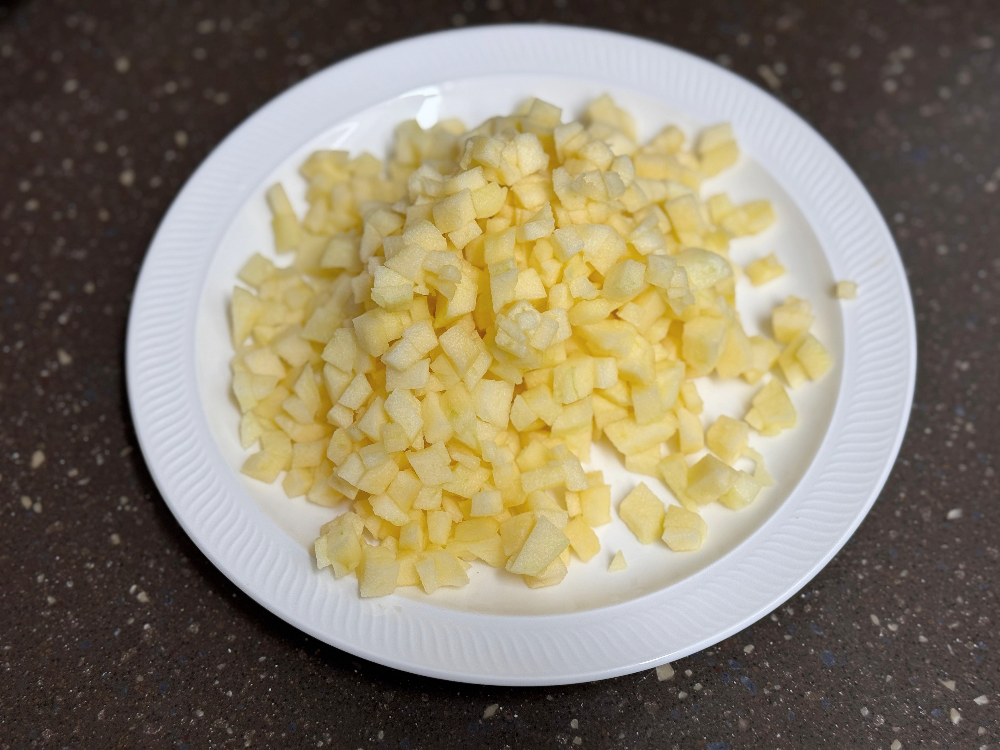 쭈글 해진 사과는 껍질을 깎아 잘게 잘라주세요. 식감이 있는 걸 좋아하시면 조금 더 크게 썰어도 좋습니다.