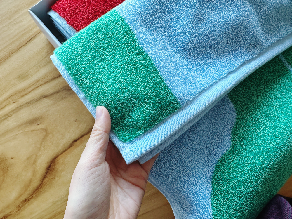 수건이 꽤 도톰한데 가볍고 부드럽습니다. 수건 위아래가 서로 반대 색상이라 뒤집어 놓아도 이쁘답니다.