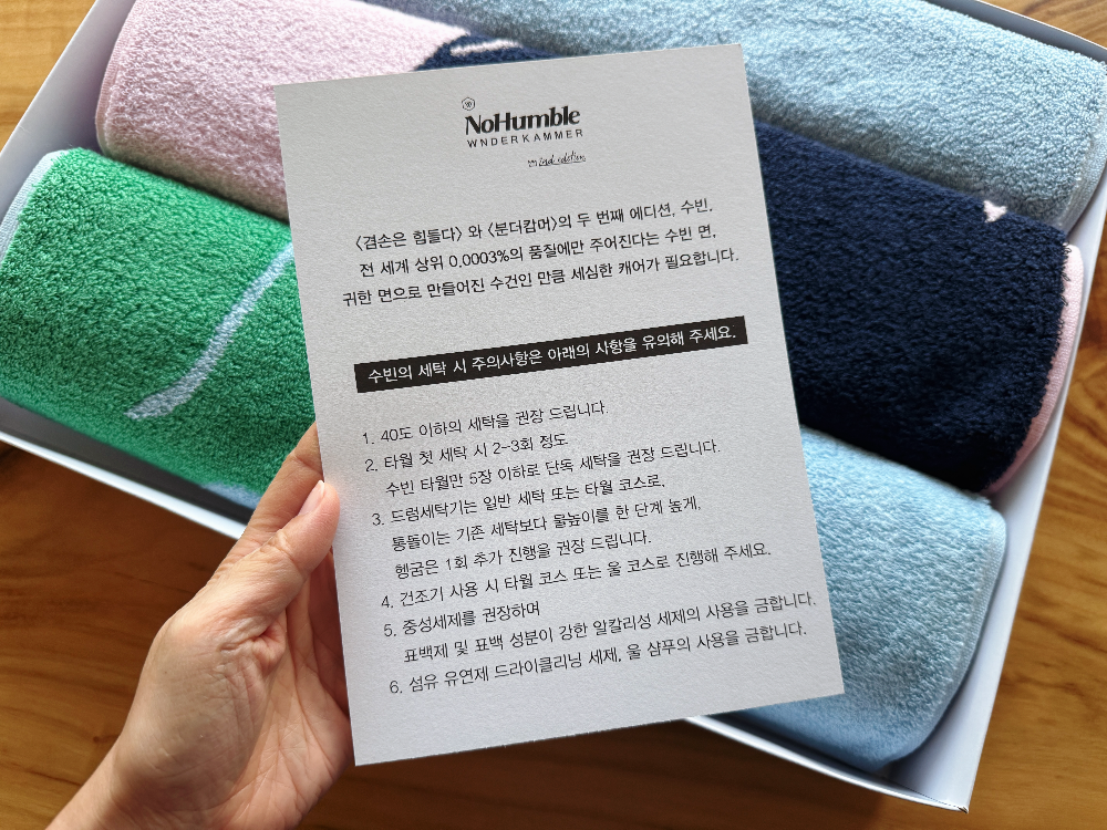 겸손몰 수빈면 수건은 패션 디자이너인 분더캄머 신혜영 대표가 디자인하고 충무타올에서 제작을 했는데요. 충무타올에서 신규론칭을 위해 준비한 수빈면 물량을 모두 겸손몰 수빈 수건을 만드는 데 사용했다고 해요. 수빈면은 인도에서 나오는 최고급 목화인데 전 세계적으로 재배 물량이 적고 구하기 힘든 면이라고 합니다. 확보된 물량으로 먼저 제작하고 모자란 물량은 봄에 새로 수빈면을 수확해서 만들어서 보내준다고 했었는데.. 아마도 제가 받은 건 3개월이나 걸렸으니까 새로 갓 수확한 수빈면으로 만든 수건인 듯해요 :-)