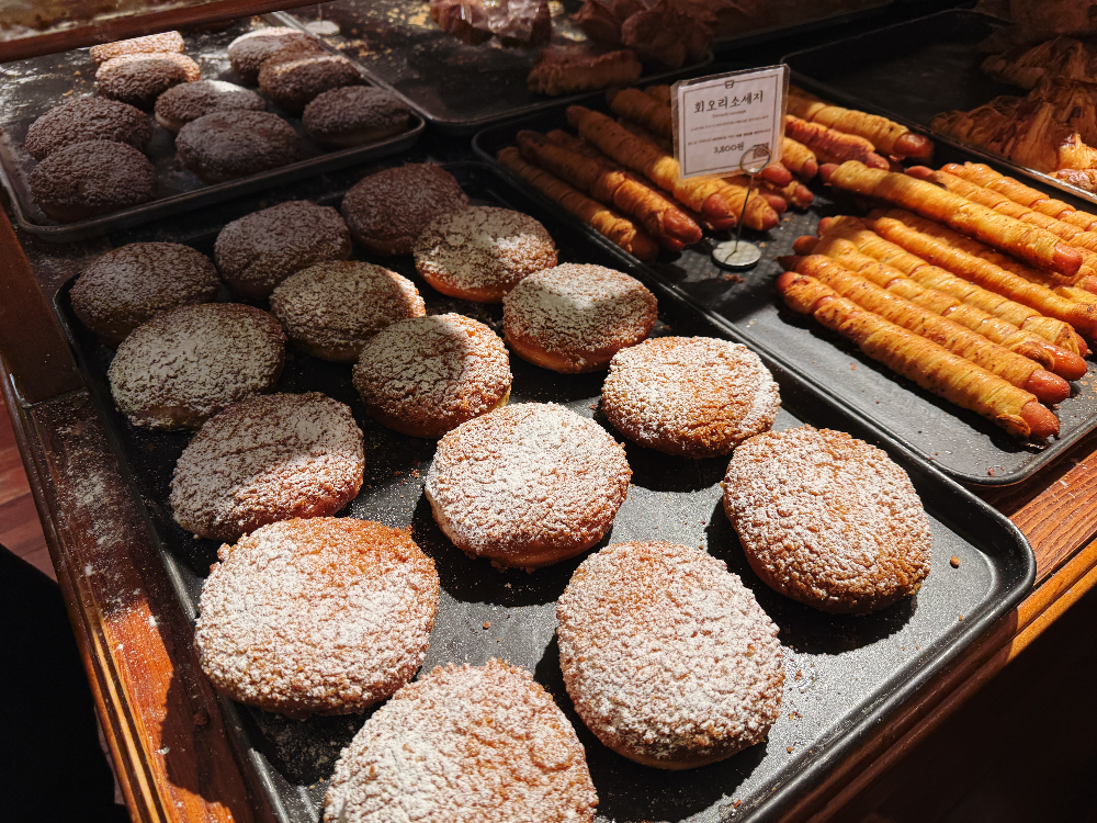 매장 안에 들어가면 줄을 서서 빵을 고르지 말고 자유롭게 이동하라고 직원들이 안내를 하는데요. 집게와 쟁반을 들고 요리조리 다니면서 빵을 담으면 됩니다. 빵이 빈 곳이 많았는데요. 고로케 맛이 궁금했는데 고로케는 하나도 없었.. 습니다. 다행히 튀김소보로는 종류별로 많이 남아있어 하나씩 맛볼 수 있었답니다.