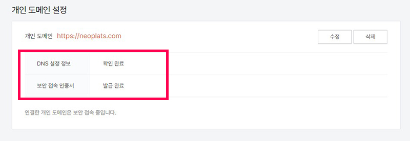 자~ 이렇게 DNS 설정 정보와 보안 접속 인증서가 완료로 뜨면 개인 도메인 설정이 완료된 것입니다.