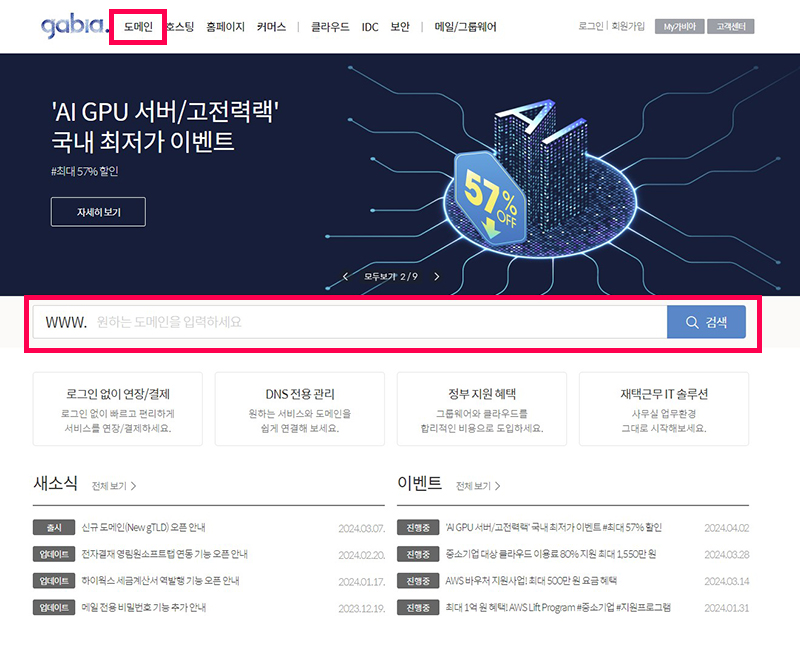 가비아 사이트 상단 메뉴 중 도메인을 클릭하거나 가운데 커다란 검색창에서 원하는 도메인을 입력하고 검색을 눌러주세요.