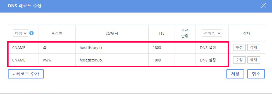 두 번째는 타입 CNAME | 호스트 www | 값/위치 host.tistory.io. | TTL 1800