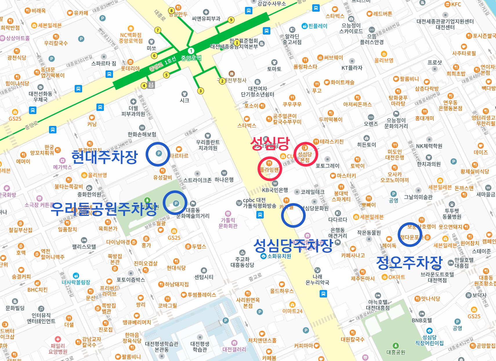 성심당 본점 방문 시 성심당주차장, 우리들공원주차장, 현대주차장, 정오주차장 총 4곳의 주차장을 이용할 수 있습니다.