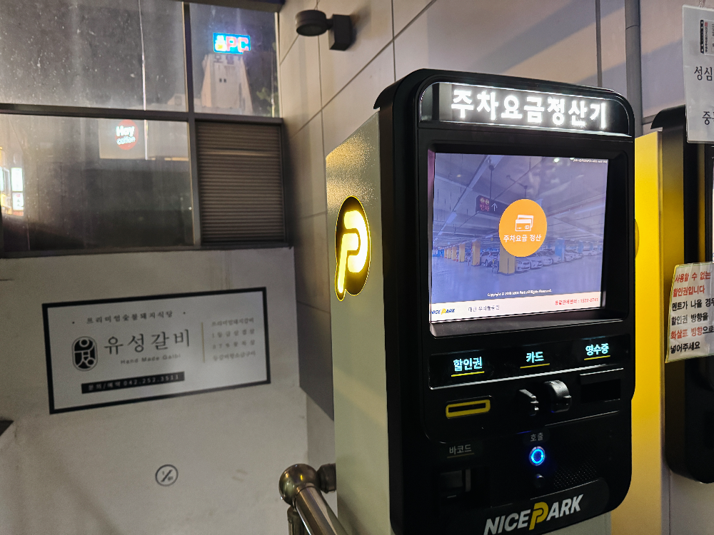 우리들공원 주차장 엘리베이터 옆에 주차요금정산기 2개가 있습니다. 정산기 2개 다 사용 가능하고 정산할 때 할인권 2장을 차례대로 넣으면 된답니다~ 저녁을 먹고 오느라 이용시간이 2시간 넘었을 줄 알았는데 2시간이 조금 안 돼서 무료로 출차했답니다.