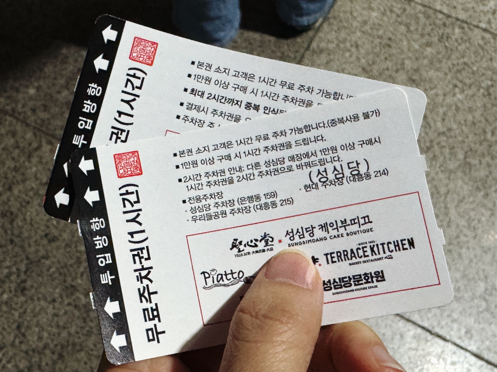 성심당 케익부띠끄와 성심당 본점에서 각각 받아 온 1시간 무료주차권 2장입니다. 2시간 적용하려면 2시간 주차권 1장으로 바꿔야 한다고 되어있는데 우리들공원 주차장에서는 1시간 무료 주차권 2장 사용이 가능합니다.