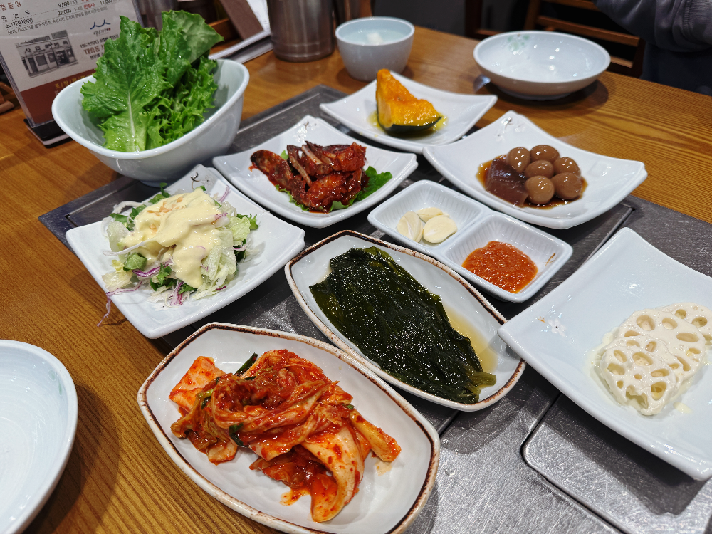 소불고기를 주문하면 여러 가지 기본 반찬들이 나오는데요. 양념게장도 나온답니다. 다른 반찬들은 괜찮았는데 김치가 약간 쓴맛이 많이 나서 겉절이를 좋아하는 짝꿍은 맛있다고 했지만 제 입에는 안 맞..았습니다.