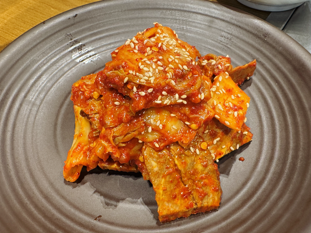 소불고기를 끓이는 사이 나온 사리원면옥의 별미메뉴, 소고기김치비빔입니다. 소고기김치비빔은 냉면에 고명으로 올라가는 고기와 김치를 양념에 비빈 메뉴인데요. 곁들임 메뉴로 반접시를 주문했습니다. 접시가 커서 사진상으로는 양이 적어 보이는데 생각보다 양이 많았습니다. 고기가 많이 들어있어 고기 반, 김치 반이었답니다.