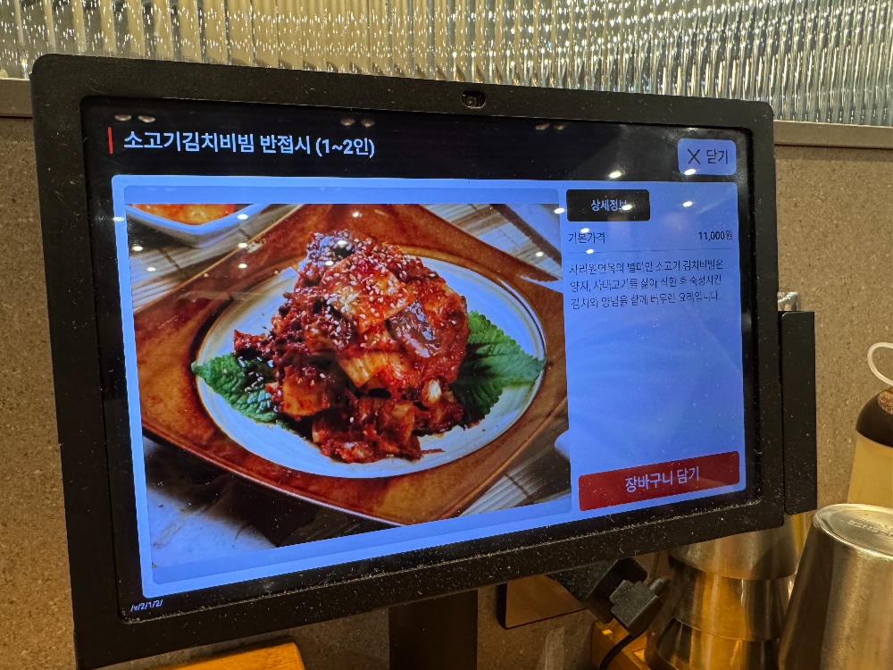 사리원면옥은 가게 이름에서 알 수 있듯이 평양냉면 맛집인데요. 소불고기와 갈비탕도 인기메뉴라고 합니다. 그 외 만둣국, 돼지양념갈비, 소양념갈비도 있습니다. 아점을 먹고 아무것도 안 먹었던 짝꿍과 저는 소불고기와 소고기김치비빔이라는 특이한 메뉴를 주문했답니다. 소불고기는 2인 이상 주문해야 하고 공깃밥은 별도입니다. 주문은 키오스크로 하면 되고 계산은 나갈 때 하면 됩니다.