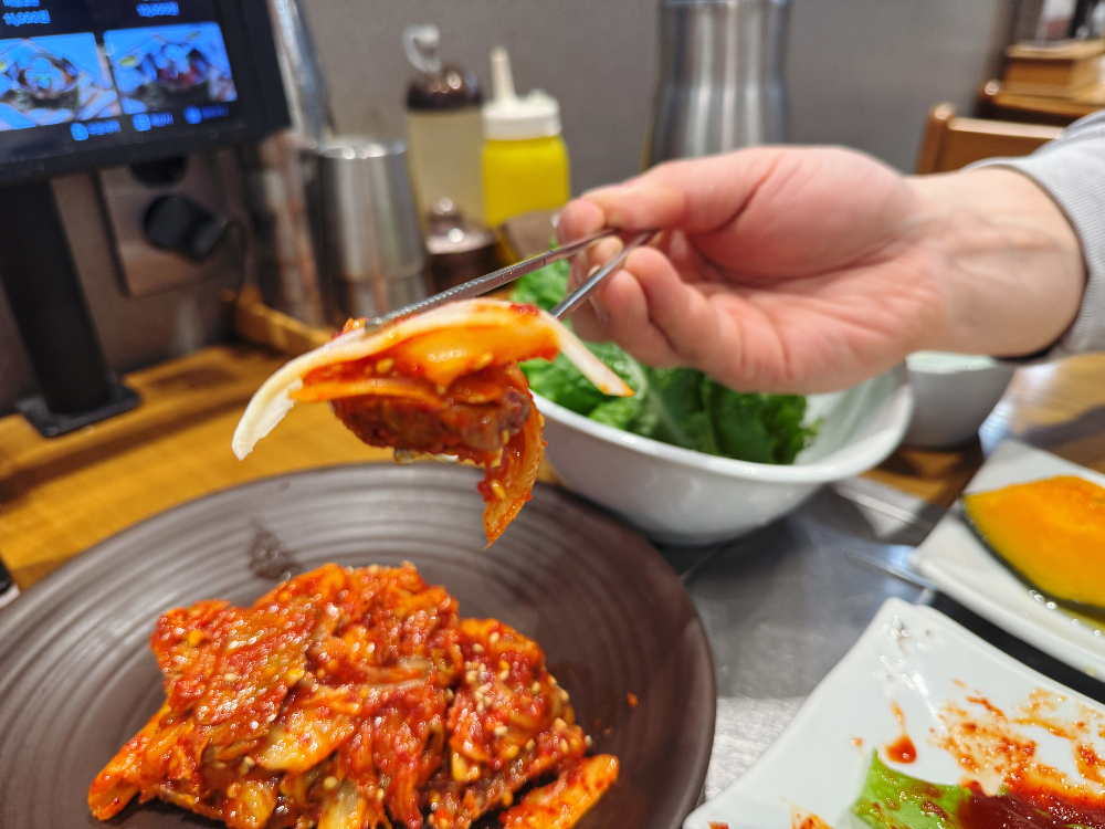 소고기김치비빔에는 냉면 먹을 때 나오는 하얀 무가 같이 나옵니다. 하얀 무로 김치와 고기를 싸서 같이 먹으면 맛있습니다. 매콤 달콤 계속 끌리는 맛이라 냉면과 같이 먹었으면 더 맛있을 것 같았는데요. 배가 고파 소불고기를 시킨 걸 그새 잊어버리고 냉면을 안 시킨 걸 살짝 후회했답니다. 배가 고파 손이 떨렸는지.. 맛있어서 급하게 먹느라 그랬는지 사진도 초점이 안 맞았.. 네요. 정말 마지막 한 점까지 맛있게 먹었습니다 :-)