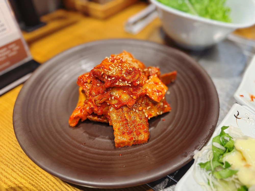 소불고기를 주문하면 여러 가지 기본 반찬들이 나오는데요. 양념게장도 나온답니다. 다른 반찬들은 괜찮았는데 김치가 약간 쓴맛이 많이 나서 겉절이를 좋아하는 짝꿍은 맛있다고 했지만 제 입에는 안 맞..았습니다.