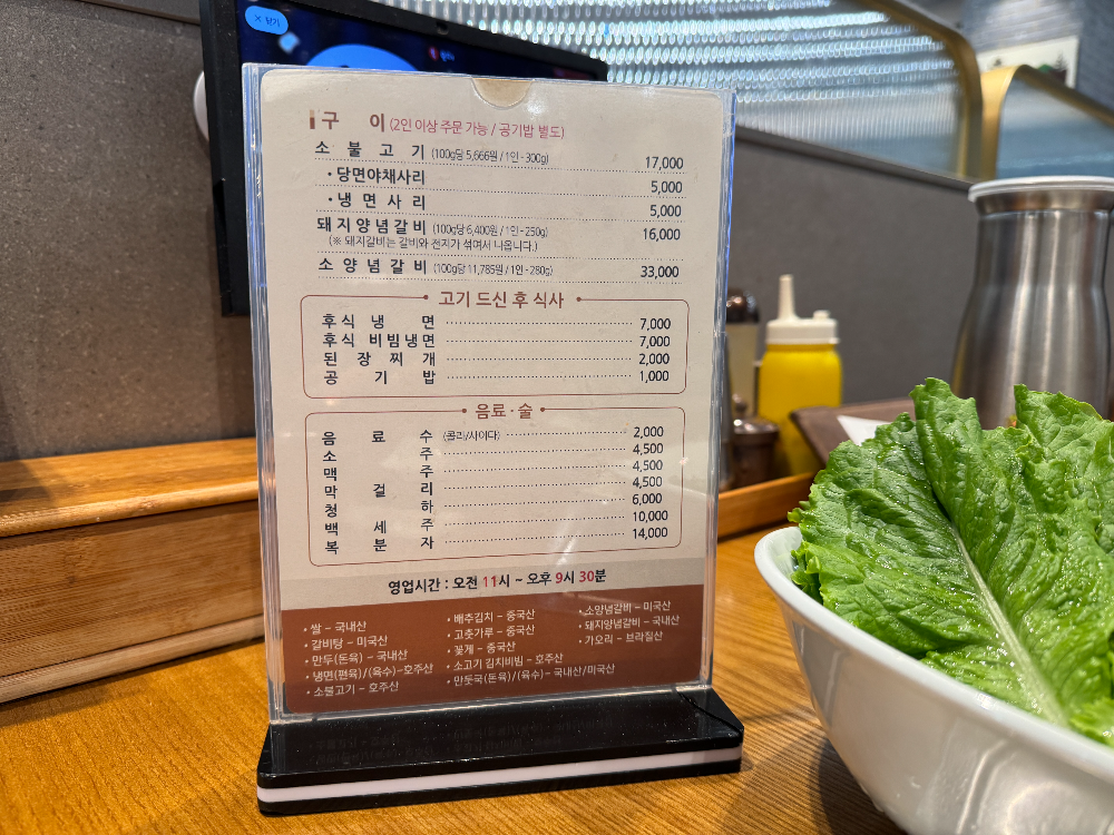 사리원면옥은 가게 이름에서 알 수 있듯이 평양냉면 맛집인데요. 소불고기와 갈비탕도 인기메뉴라고 합니다. 그 외 만둣국, 돼지양념갈비, 소양념갈비도 있습니다. 아점을 먹고 아무것도 안 먹었던 짝꿍과 저는 소불고기와 소고기김치비빔이라는 특이한 메뉴를 주문했답니다. 소불고기는 2인 이상 주문해야 하고 공깃밥은 별도입니다. 주문은 키오스크로 하면 되고 계산은 나갈 때 하면 됩니다.