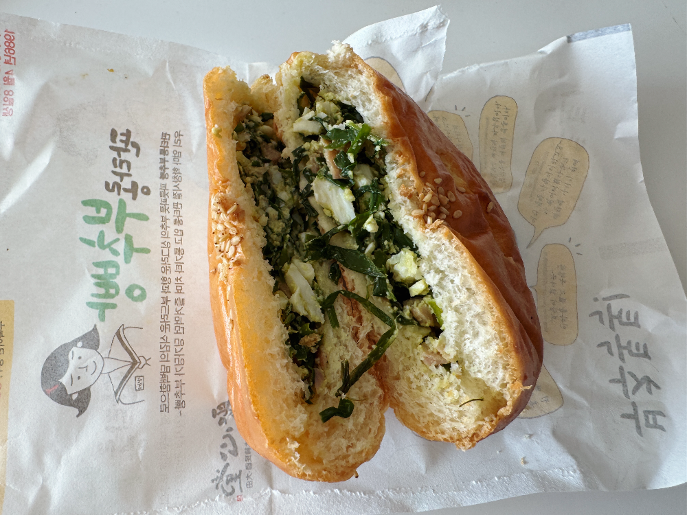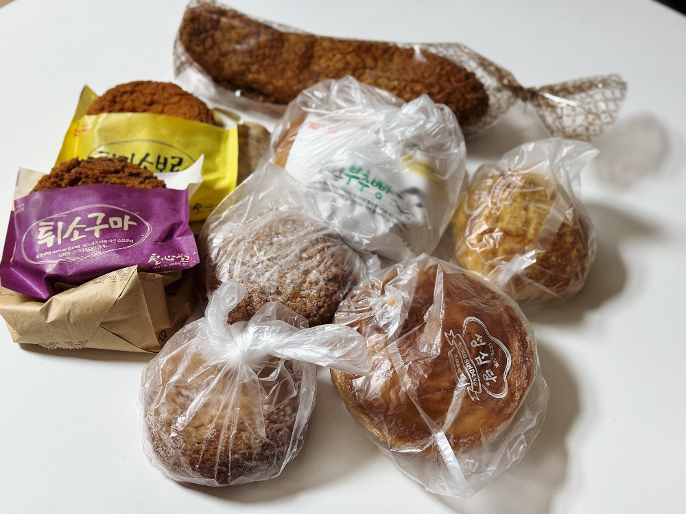 튀김소보로와 몇 가지 빵들입니다. 빵이 전체적으로 달았는데요. 튀김소보로는 한 입 먹고 오~ 맛있네라고 했다가 두 입 먹고는 너무 달아서 소보로 귀신인 짝꿍에게 줬답니다. 기대했던 부추빵도 살짝쿵 실망이었는데요. 부추빵과 비슷한 군산 이성당 야채빵이 훨씬 맛있습니다. 군산가시면 이성당 야채빵 꼭 드셔 보세요~