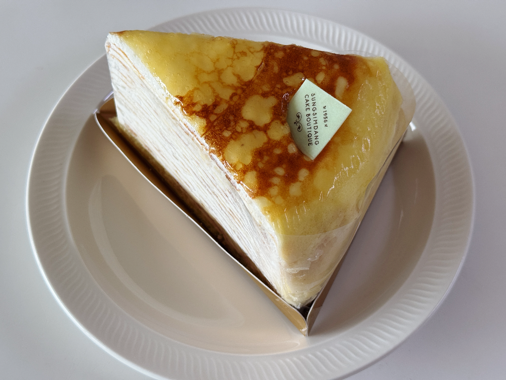 케익부띠끄에서 제가 고른 15겹크레페 조각케이크입니다. 정말 15겹의 크레페 시트와 생크림이 겹겹이 쌓여있습니다. 크레페는 시트가 두꺼우면 맛이 없는데요. 성심당 15겹크레페는 크레페 시트가 두껍지 않고 얇은 데다 생크림이 잘 펴 발라져 있어 고소하고 맛있습니다. 너무 달지 않아 먹을수록 끌리는 맛이랍니다.