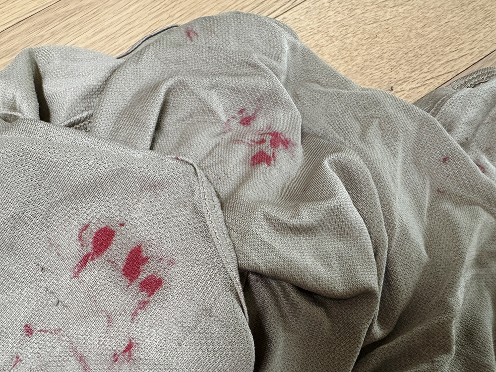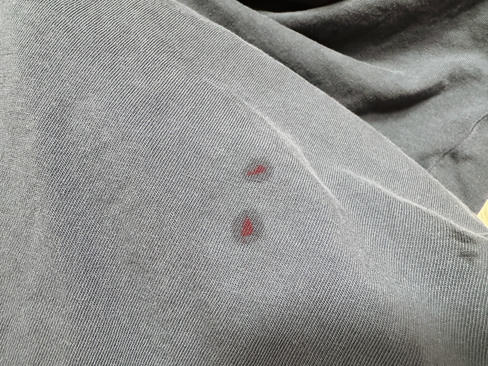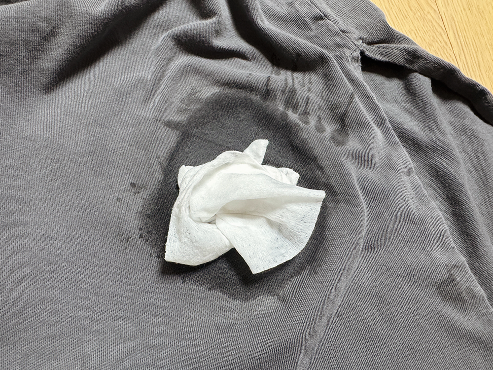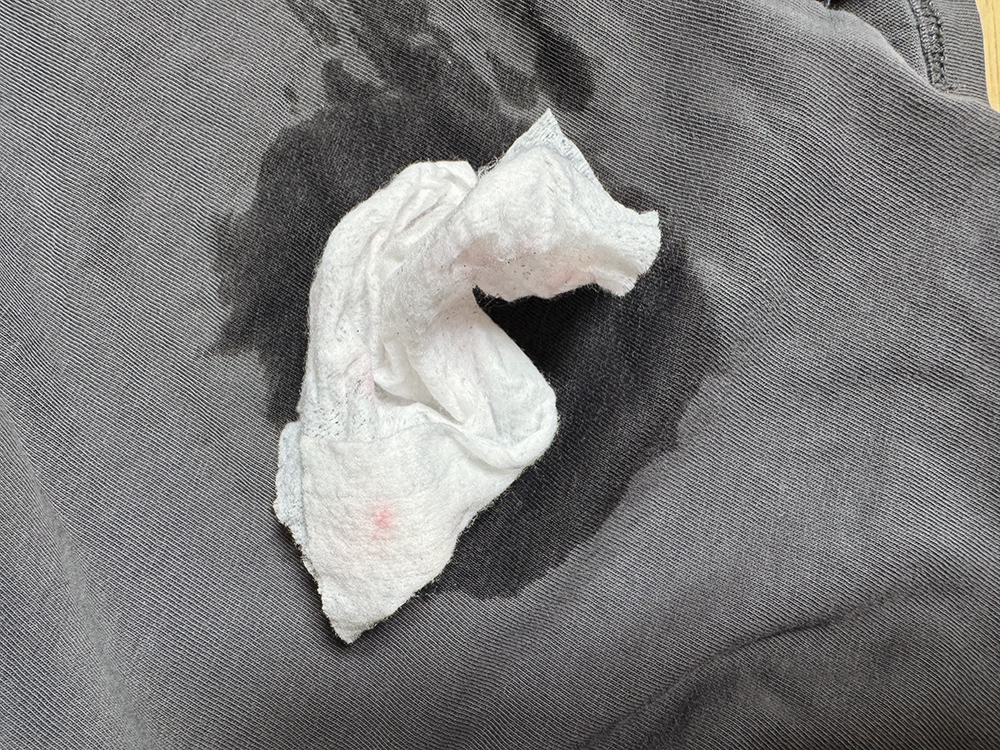 물티슈로 닦으면 립밤이 묻어 나옵니다. 면으로 된 옷은 잘 지워지지 않아 조금 세게 문질러 줬습니다. 폴리에스테르 같은 얇은 옷은 지울 때 뒷면에 스며들어 반대쪽에도 오염이 되는데요. 반대쪽이 오염되지 않도록 옷 사이에 천이나 휴지를 대고 지워야 한답니다.