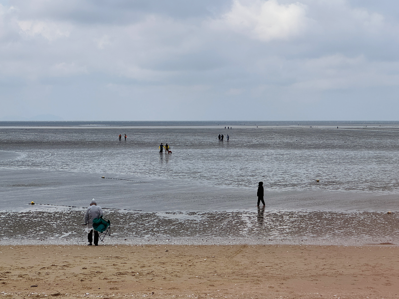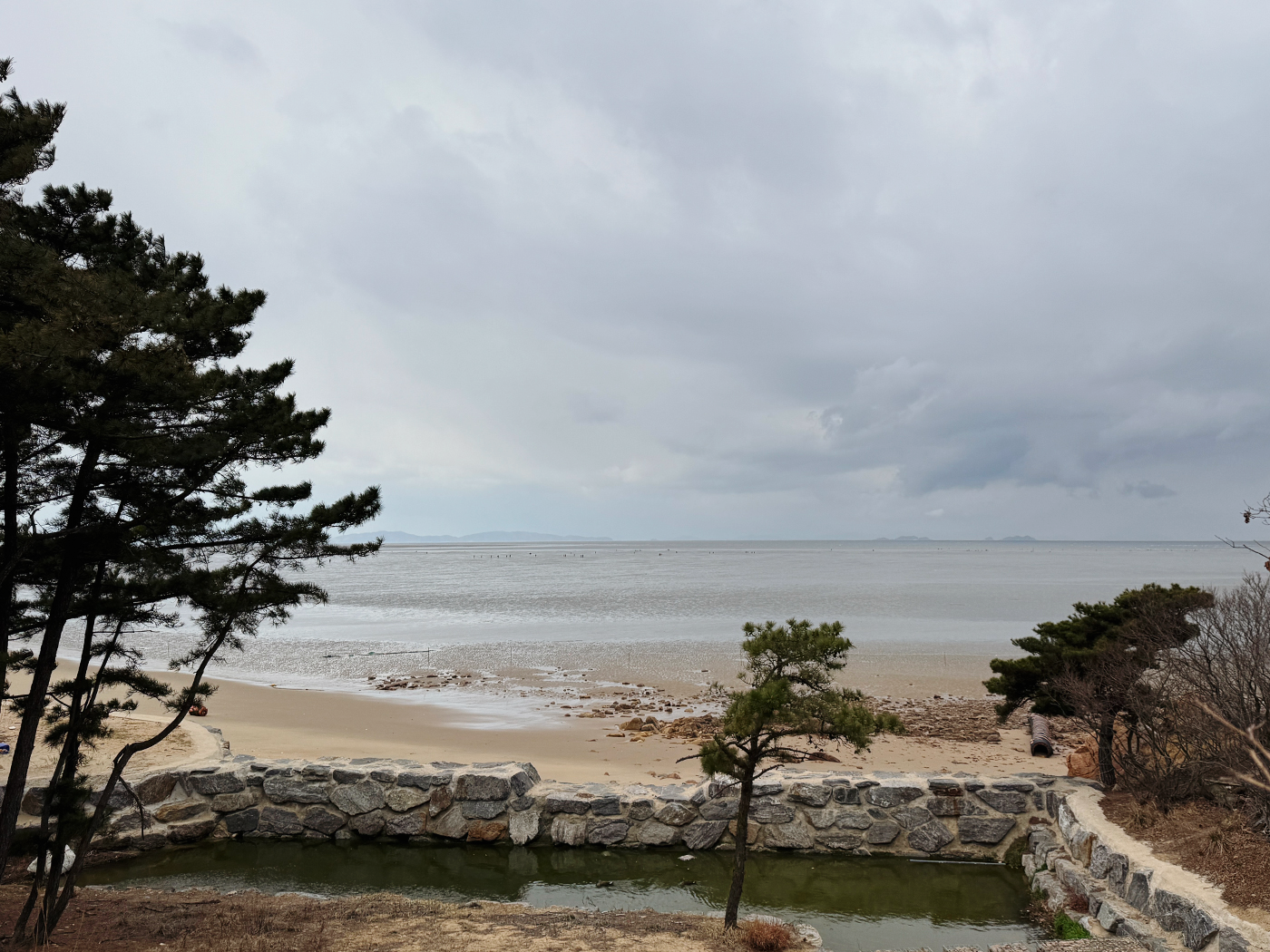 다음날 아침, 늦잠을 자고 일어났더니 썰물이라 갯벌이 생겼습니다. 갯벌 위에 있는 사람들이 개미처럼 작게 보입니다. 무의도 자연휴양림은 바닷가로 나가는 길을 막아놓아 휴양림에서는 바로 해변으로 나갈 수 없는데요. 갯벌로 나가려면 하나개해수욕장으로 가야 한답니다.